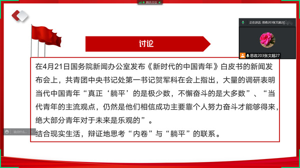 马克思主义学院思政211班的团员代表崔珂萌在学习领会习近平总书记重要讲话后深受鼓舞:“青年一代是中华民族伟大复兴新征程上的主力军,我们要主动学好思政课,努力成长为与历史同向、与祖国同行、与人民同在的时代新人。我一定坚定不移听党话、跟党走,始终奋进在新时代前列,以实现中华民族伟大复兴为己任,不断增强志气、骨气和底气,不负韶华,不负时代,不负人民!”
