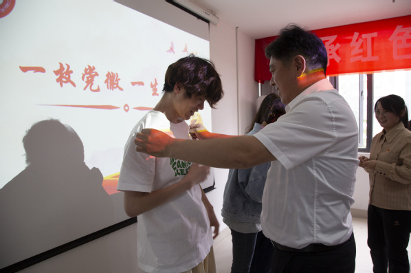 活动中,党员教师为毕业生党员们佩戴党徽,一枚党徽意味着一生责任,时刻提醒同学们自己是一名共产党员,要始终牢记为人民服务。给毕业生党员赠送“青春马院,一生守望”纪念印章,希望同学们带着母校对所有毕业生党员的深情和期待开启人生新篇章。毕业生党员周冰怡和陈家柠发言,表达了对母校的感激和深深的不舍之情。