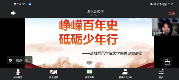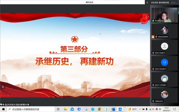 6月1日晚上,马克思主义学院大学生理论宣讲团组织开展“峥嵘百年史,砥砺少年行”主题的线上宣讲,学习习近平总书记在庆祝中国共青团成立100周年大会的讲话,深刻认识共青团百年征程的宝贵经验。