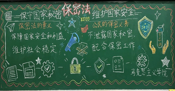 活动期间,学院组织学生制作保密法治主题黑板报,绘制过程中大家查阅资料,以图文并茂的形式普及保密法规与安全常识,让保密知识看得见、记得牢、用得上,引导同学们在耳濡目染中严守保密底线,自觉抵制各类泄密行为。